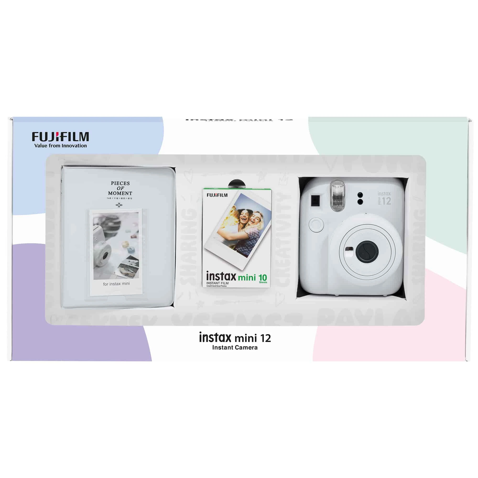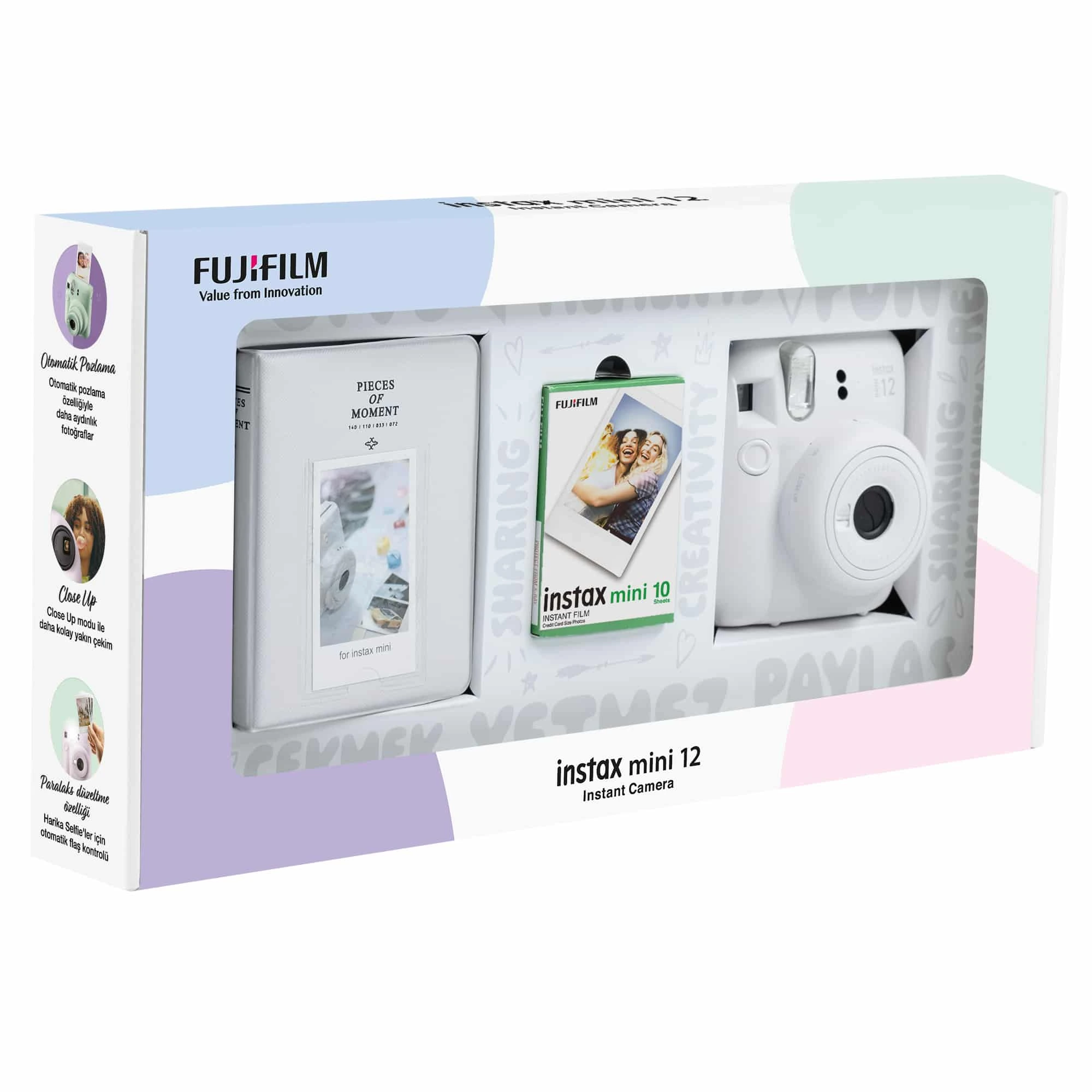 Instax mini 12 Beyaz Fotoğraf Makinesi 10'lu Film ve PVC Albüm Bundle Box