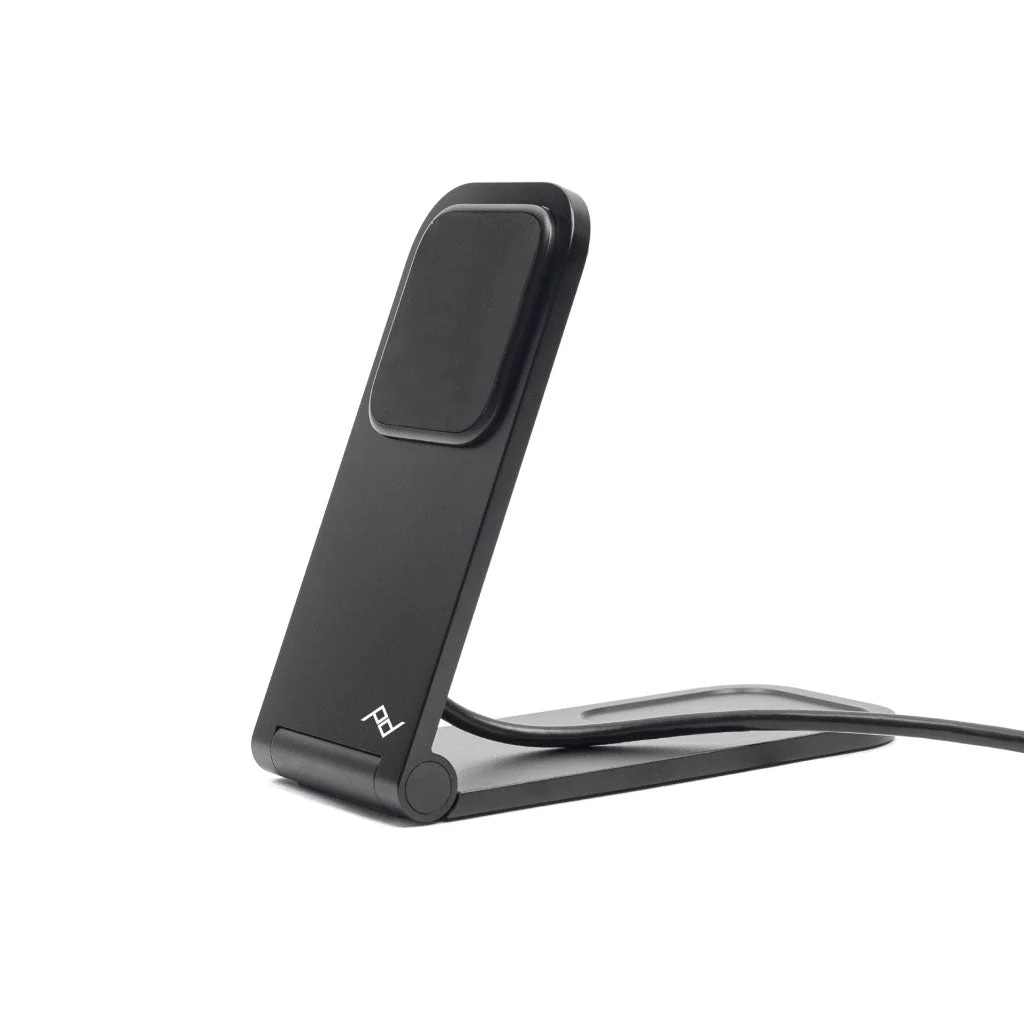 Peak Design Wireless Charging Stand, masaüstü heykeli gibi estetik bir görünüme sahip, aynı zamanda fonksiyonel bir şarj standıdır. Hassas işlenmiş anodize alüminyum gövdeye sahip bu stand, ultra düzgün sürtünmeli menteşe sayesinde telefonunuz için ideal görüntü açısını ayarlamanızı sağlar. Manyetik SlimLink™ sistemi, telefonunuzu portre veya manzara modunda "tıngırdadırır" bir sesle tutar ve anında yerinden çıkarmak için basit bir düğmeye basmanız yeterlidir. Stand, telefonunuzun hem şarj edilmesini hem de sabit konumda kalmasını sağlayacak şekilde özel olarak tasarlanmıştır. Gri silikon taban, standın kaymasını önlerken, estetik ve minimalist çizgiler ofis, masaüstü veya yan sehpa gibi her ortamda sofistike bir görünüm sunar.